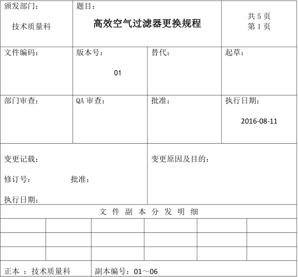四、某制药厂高效过滤器更换规程表格
