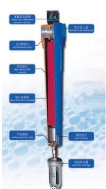 过滤器在过滤时,压缩空气先进入滤芯中间向四周扩散,经过滤芯过滤后进入滤芯与壳体的间隙,再通过过滤器出口排出下游。压缩空气中的固体悬浮物被滤芯(纤维)捕捉后留在内部、液体(如凝结水、油雾等)被滤芯(纤维)捕捉后由于其重力的作用流至滤芯低部,通过海绵的“潮湿带”(在“潮湿带”处由于压力降较大没有空气流过,故称为“安静区”,流至过滤器壳体底部,由自动排水器排至外界。