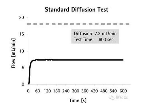 下面,我们将在自动测试时间模式下,采用完全一致的测试参数重复对相同的滤芯进行扩散流测试。第一次测试过程中,扩散流测试(测试阶段)耗时为10 min,但是当我们启动自动测试时间时,只需要65 s 就可以终止测试了(图 3)。该测试被判定为“通过”,扩散流测试值同样为7.3 mL/min。因此,这就意味着,测试阶段时间可以缩短89%,而且测试结果完全相同。实际上,测试结果并不需要必须完全相同,因为扩散流曲线随时间衰减,测试开始阶段的扩散流值要高于测试结束阶段的扩散流值。就这点而言,如前所述的一个重要事实是,实际测试结果明显低于相关标准限值。这一事实表明,缩短测试时间仍旧能够提供准确的结果。