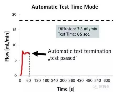 图3 采用自动测试时间模式对Sartopore® 2滤芯进行的扩散流测试,测试只经过65 s 就已成功终止,相当于测试时间缩短了89%