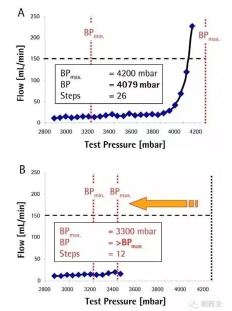 在第一张图(图4A)中,预先设定的最小泡点值BPmin 为3200 mbar,最大泡点值BPmax 为 4200 mbar。在4079 mbar 时测得泡点, 总共需要26级压力水平。在第二张图( 图4B)中,将最大泡点值BPmax 降低为3400mbar。这就意味着,一旦达到设定的最大泡点值BPmax,Sartocheck®4 plus就会终止测试,并显示信息:“测试通过,BP>BPmin”。如上所述,最小泡点值是唯一作为判定泡点测试结果的关联指标;然而最大泡点值BPmax 与测试结果判定毫无关系。实质上,最大泡点值BPmax 仅仅反映了终止测试(结果通过)的最大测试压力。在上面的例子中,只需要12 级压力水平;经过换算,即所需的测试时间缩短了50% 以上。