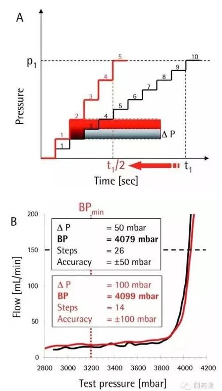 图5 改变BP 测试的压力增量水平,将压力增加步长从50 mbar 提高至100 mbar,只需要一半的测试时间,就能够分别达到所需的压力