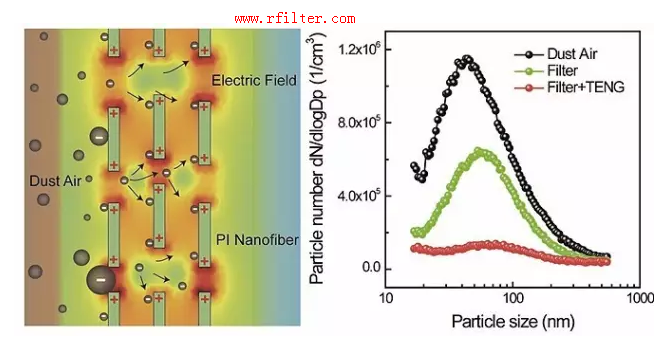 图1. 过滤器去除空气中PM的原理和不同过滤器对PM的去除效果。(左)R-TENG增强的PI纳米纤维过滤器去除空气中PM的原理示意图;(右)不同过滤器对PM的去除效果对比图。