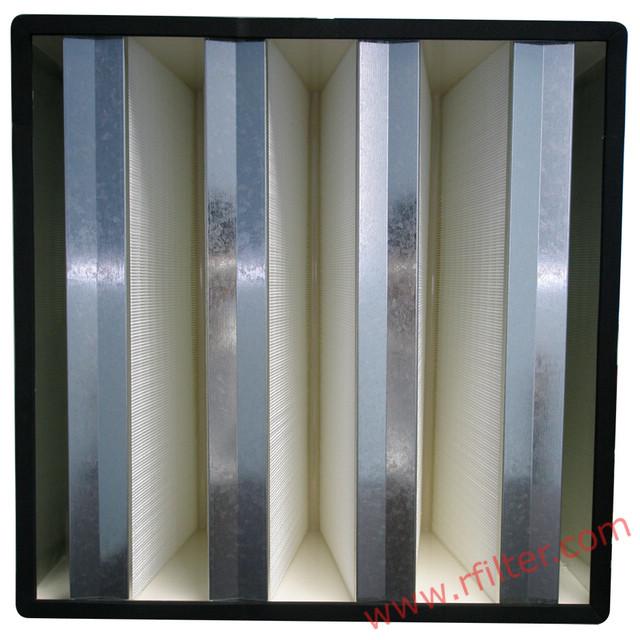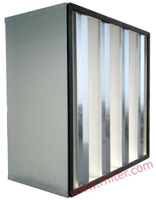 组合式高效过滤器由多片无隔板滤芯组成V形结构,安装在喷塑的镀锌钢板或者ABS滤料箱体中制成。与普通过滤器相比,这种构造极大的增加了滤料数量,在现有的系统安装中,较大的过滤器滤料面积保证了较低压损,从而降低了能源消耗,节省了运行成本。
